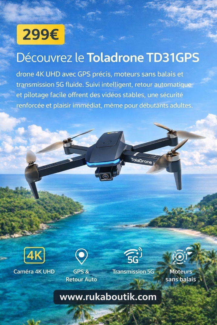 Découvrez le Toladrone TD31GPS : drone 4K UHD avec GPS précis, moteurs sans balais et transmission 5G fluide. Suivi intelligent, retour automatique et pilotage facile offrent des vidéos stables, une sécurité renforcée et un plaisir immédiat, même pour débutants adultes.