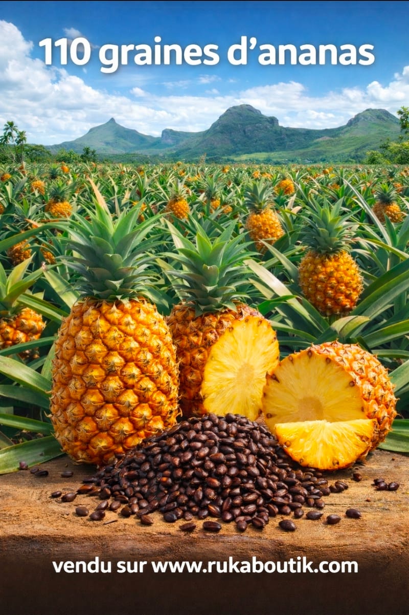 Découvrez 110 graines d’ananas pour cultiver chez vous un fruit tropical savoureux et exotique. Idéal pour les jardins, balcons ou cultures en pot, ce lot sélectionné garantit une excellente germination. Apportez une touche tropicale à votre quotidien et profitez du plaisir de faire pousser vos propres ananas, du semis à la récolte. Disponible sur www.rukaboutik.com. 🌴🍍 #ananas