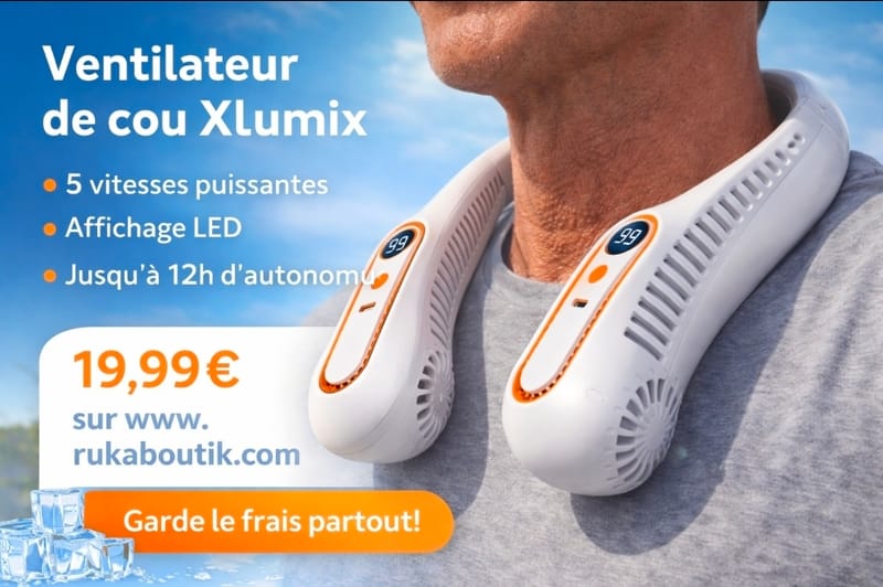 Le ventilateur de cou XLumix offre 5 vitesses puissantes, un affichage LED moderne et jusqu’à 12h d’autonomie. Léger, silencieux et ergonomique, il garantit un confort frais continu au travail, en sport ou en voyage, même pendant les fortes chaleurs estivales.